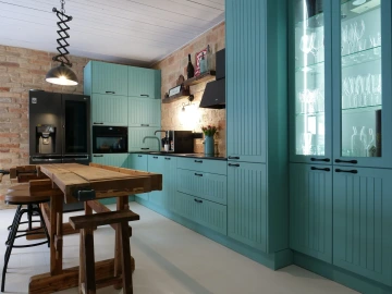 Tato kuchyně zaujme na první pohled odstínem tyrkysově zelené, který do interiéru vnáší svěžest a osobitý charakter. Při této realizaci jsme usilovali o propojení tradičních prvků s moderním designem, aby výsledek působil přirozeně i elegantně zároveň.
