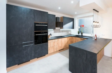 Pracovní deska i boční plochy v dekoru Břidlice černá výrazně kontrastují s teplým odstínem dřeva a dodávají celé kuchyni moderní nadčasový charakter s přirozeným vzhledem dubu a elegancí černé břidlice. Otevřená dispozice s barovým pultem nabízí nejen dostatek pracovní plochy, ale i příjemné místo pro každodenní stolování. Je to kuchyně, která zaujme na první pohled, a přitom zůstává maximálně funkční.
