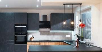 K naplnění specifik realizace se nejvíce hodila kuchyně Iris v kombinaci Dub Wotan a Břidlice černá. Pro dokonale minimalistický vzhled je kuchyně řešená bezúchytkově; jediné úchytky jsou použité z praktických důvodů na vestavěné lednici.