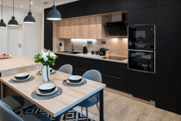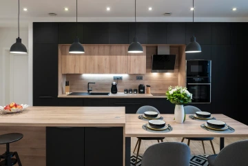 Moderní hladká kuchyňská linka Tilia v černo-dřevěném provedení, které evokuje luxus a nadčasovost.
