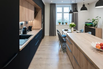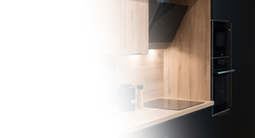 Jako základ jsme použili kuchyni Tilia v černo-dřevěném provedení, jejíž kontrasty evokují luxus a moderní minimalismus. Hladké čelní plochy v bezotiskovém dekoru Akrylux od Kronospanu působí sofistikovaně a snadno se udržují.