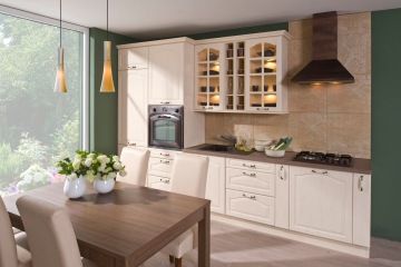 Venkovská kuchyně s kazetovými dvířky, přírodními materiály a možností výběru z tlumených barev a dřevěných prvků. Navržena pro praktické každodenní vaření a přehledné uložení.
