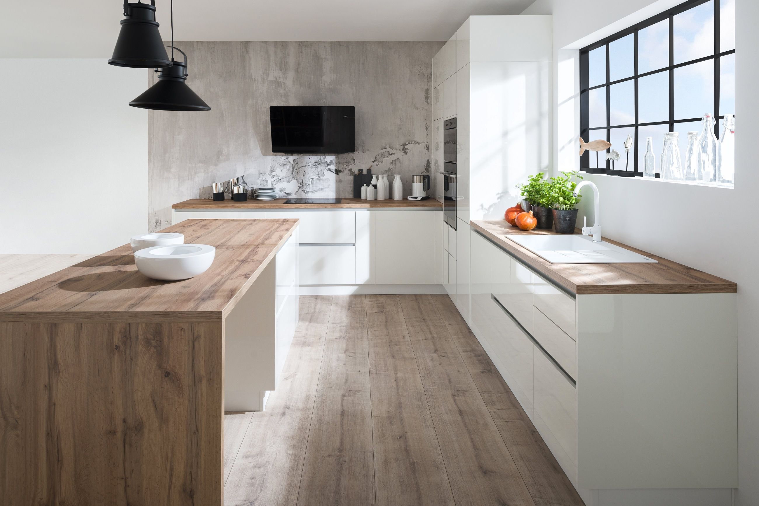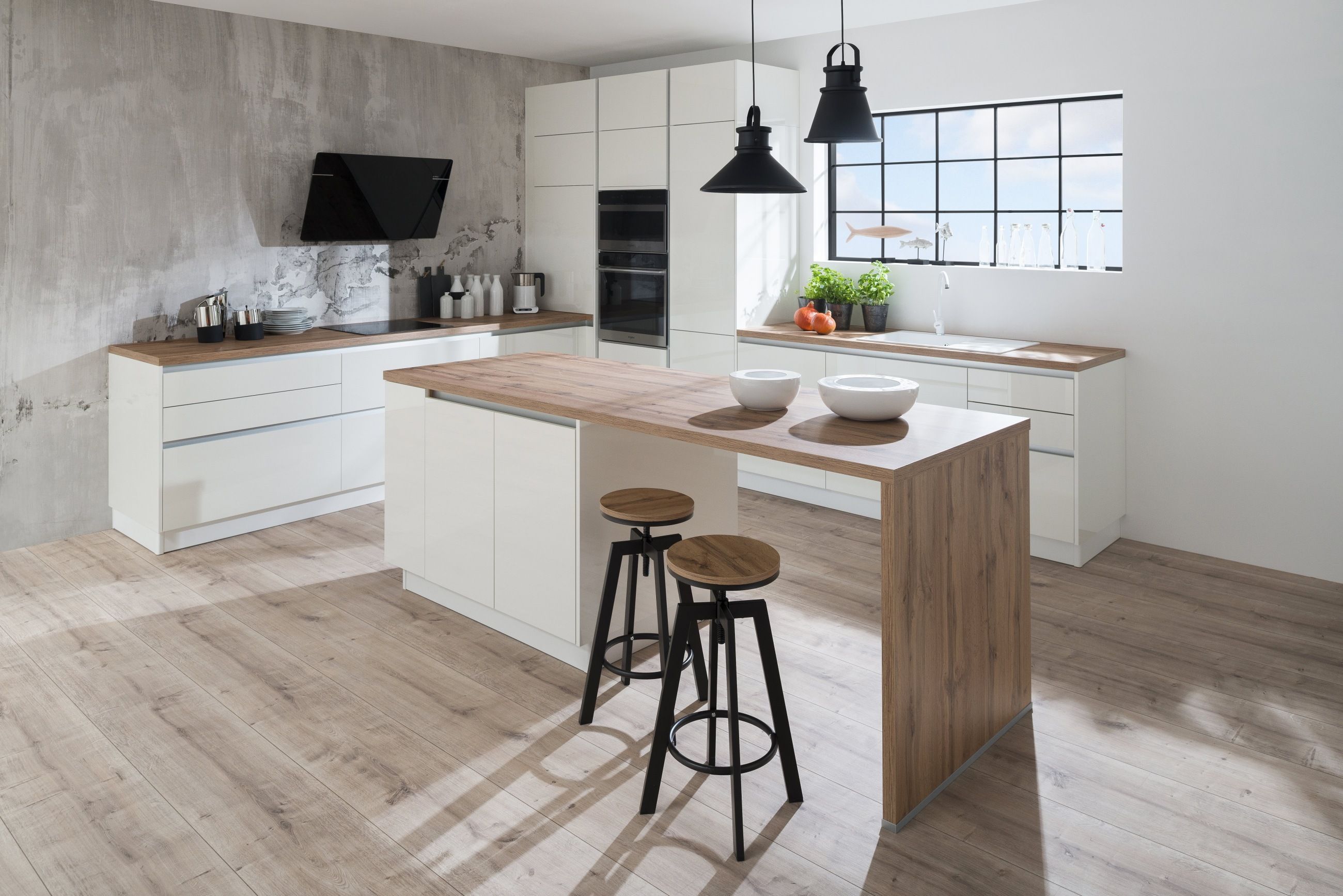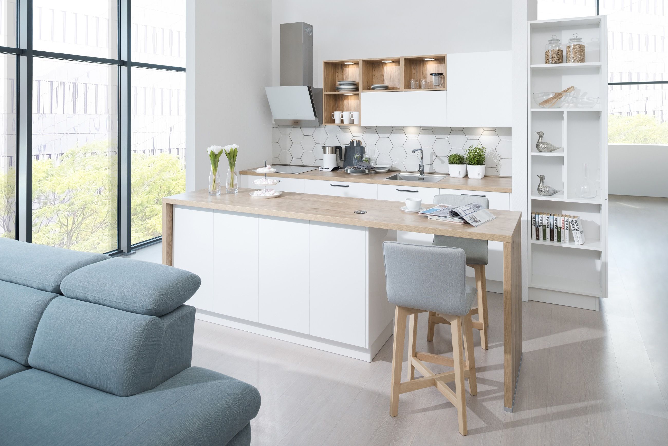 Moderní kuchyně Tilia s integrovanými úchytkami v hraně dvířek nabízí čistý, elegantní vzhled. Kombinace jednobarevných ploch a dřevodekorů umožňuje vytvořit jemně minimalistický i teplejší přírodní výraz.