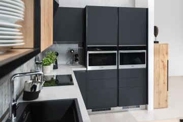 Moderní kuchyně Tilia s integrovanými úchytkami v hraně dvířek nabízí čistý, elegantní vzhled. Kombinace jednobarevných ploch a dřevodekorů umožňuje vytvořit jemně minimalistický i teplejší přírodní výraz.