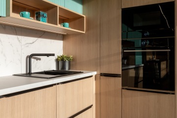 Moderní kuchyně Tilia s integrovanými úchytkami v hraně dvířek nabízí čistý, elegantní vzhled. Kombinace jednobarevných ploch a dřevodekorů umožňuje vytvořit jemně minimalistický i teplejší přírodní výraz.