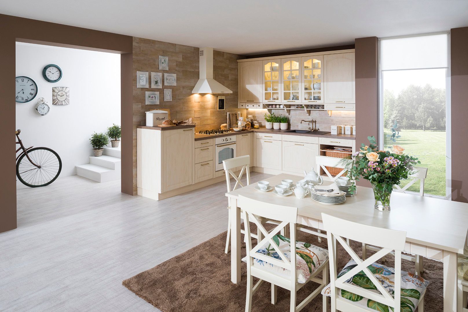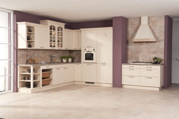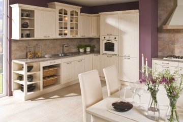 Venkovská klasická kuchyně Katy pro milovníky romantického stylu. Jemná frézovaná dvířka, kovové úchytky a vitríny vytvářejí útulný prostor s elegancí a klidem venkova. Ideální volba pro ty, kteří chtějí propojit tradici s funkčností a harmonií domova.
