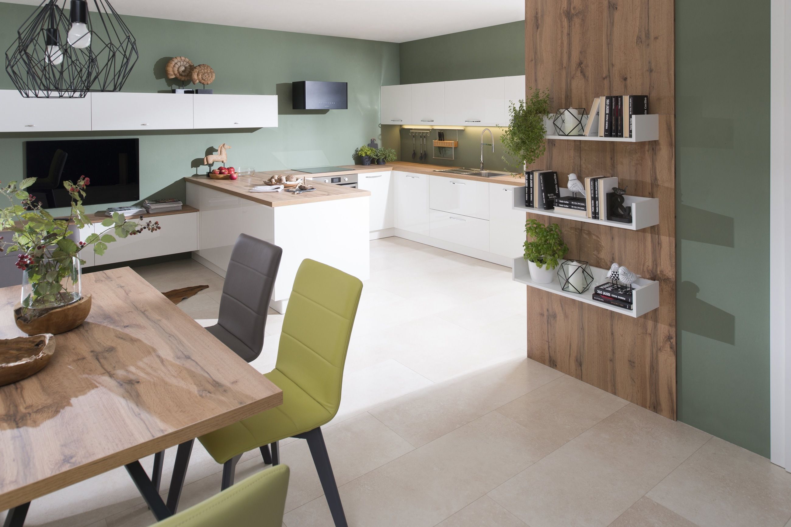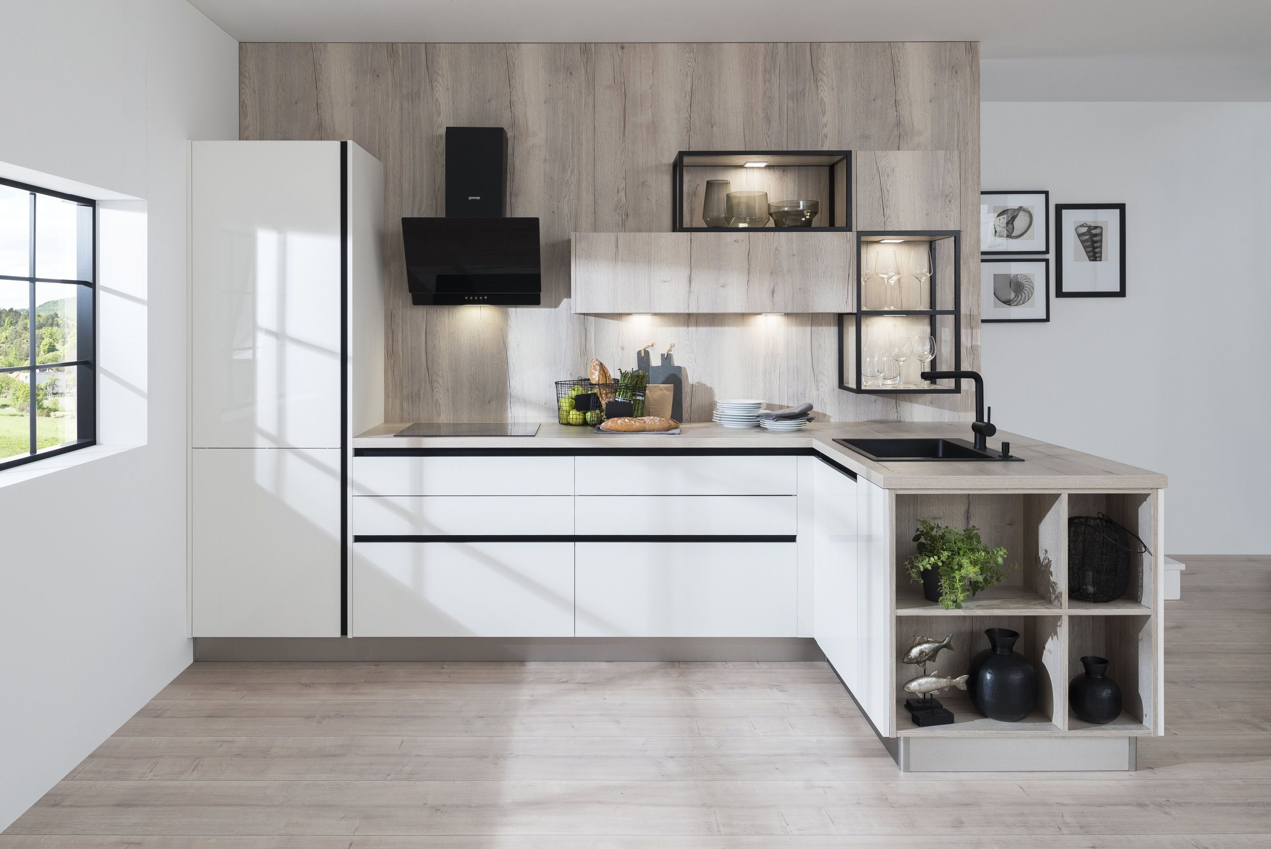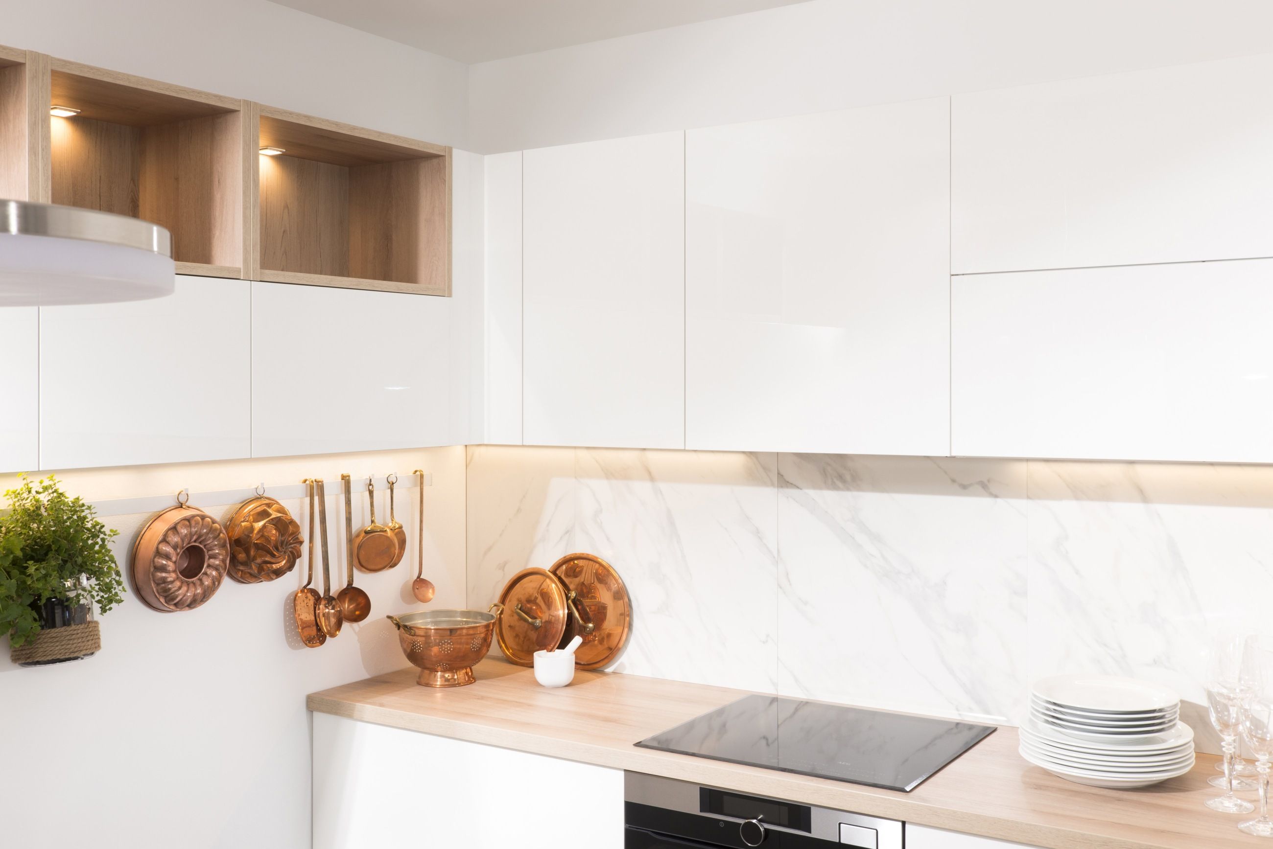 Moderní kuchyně Elis s otevřenými policemi a kombinací lesklých ploch a dřevodekorů. Nabízí čistý vzhled s odlehčeným dojmem a důrazem na detail.
