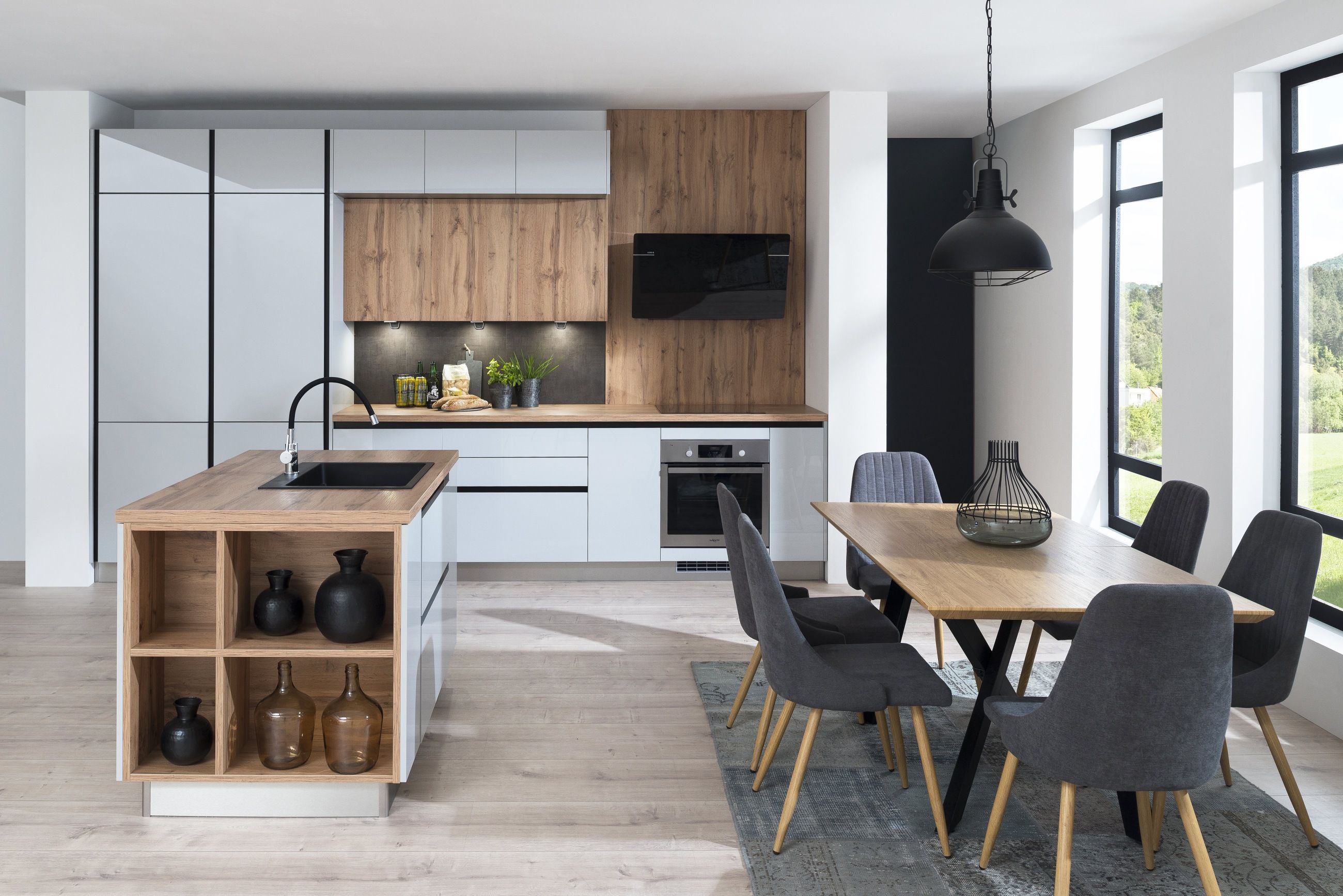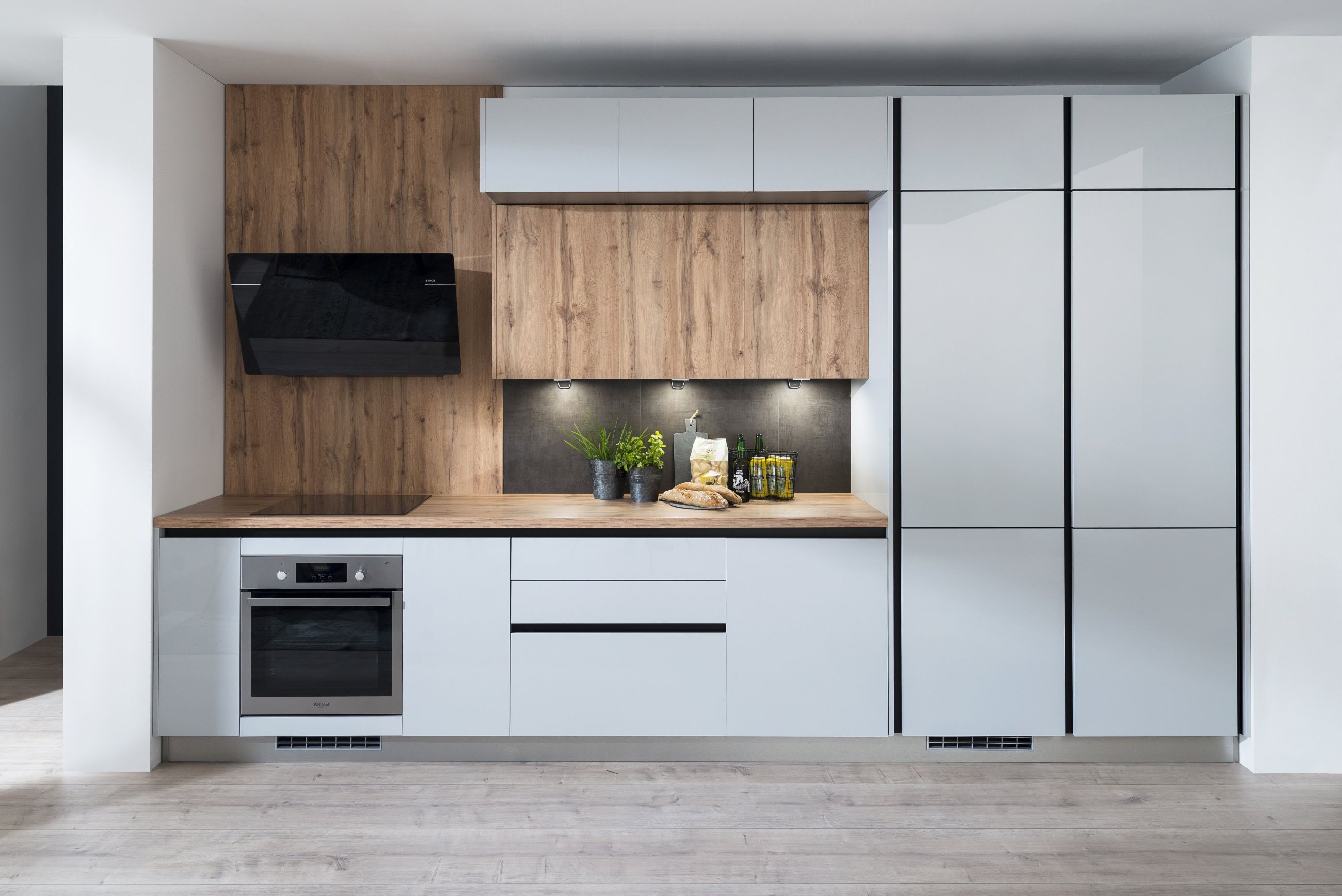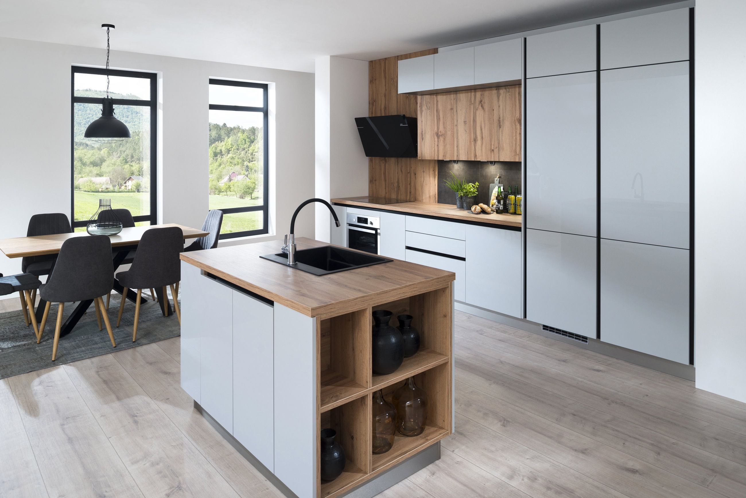Moderní kuchyně Tilia s integrovanými úchytkami v hraně dvířek nabízí čistý, elegantní vzhled. Kombinace jednobarevných ploch a dřevodekorů umožňuje vytvořit jemně minimalistický i teplejší přírodní výraz.
