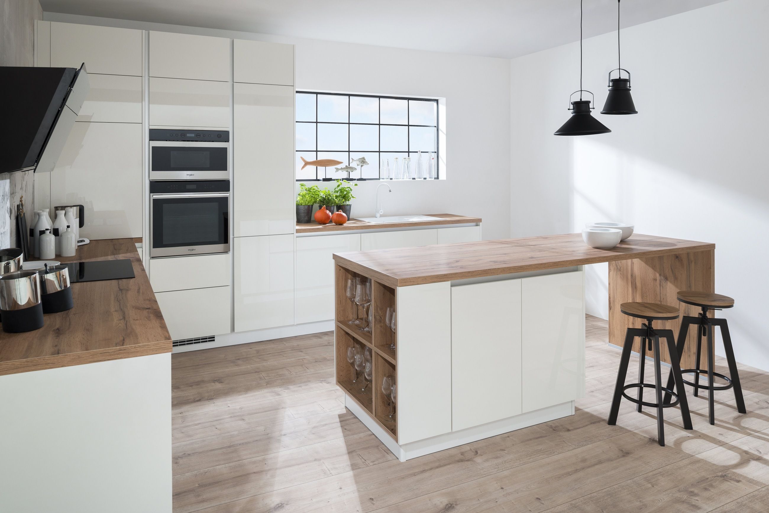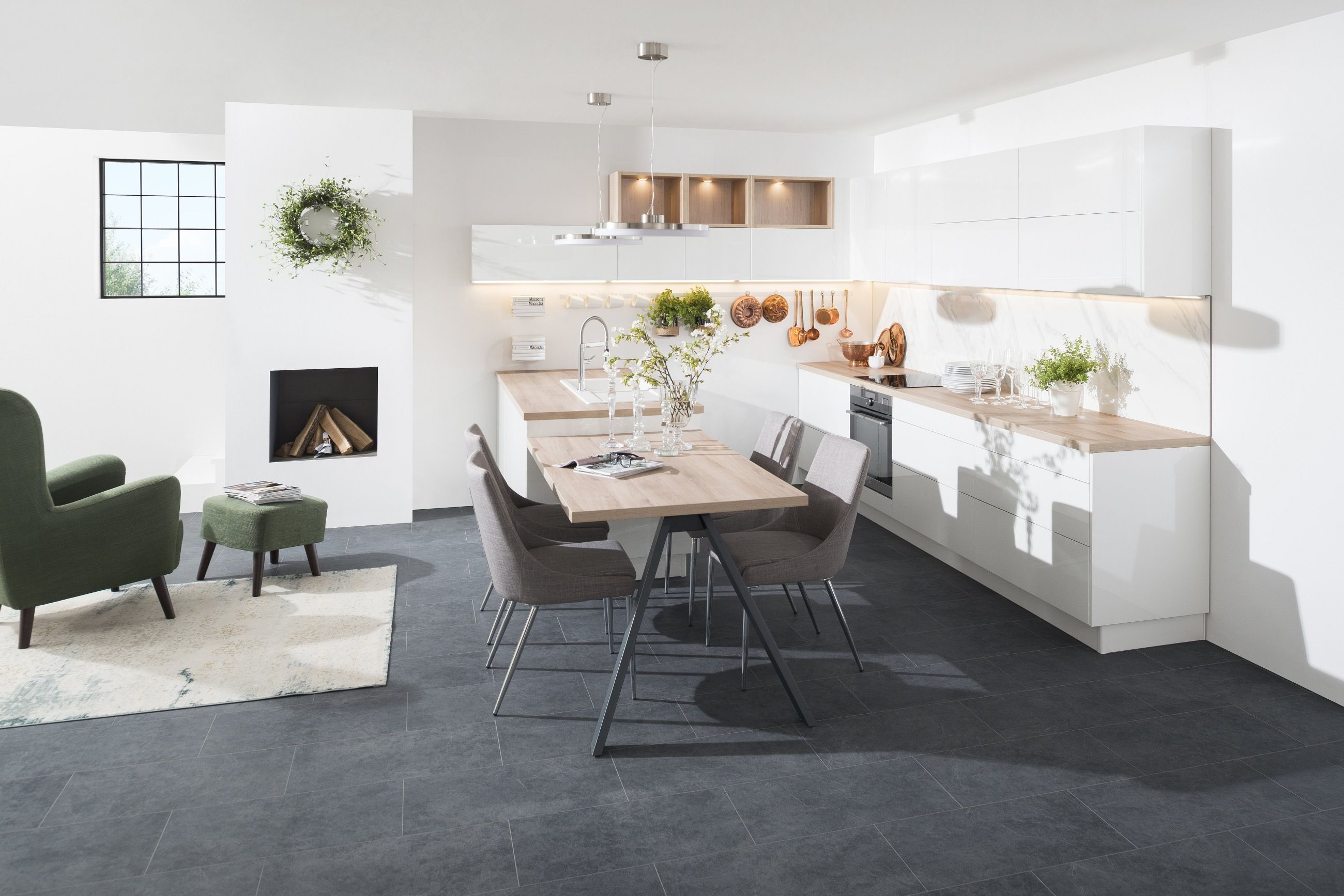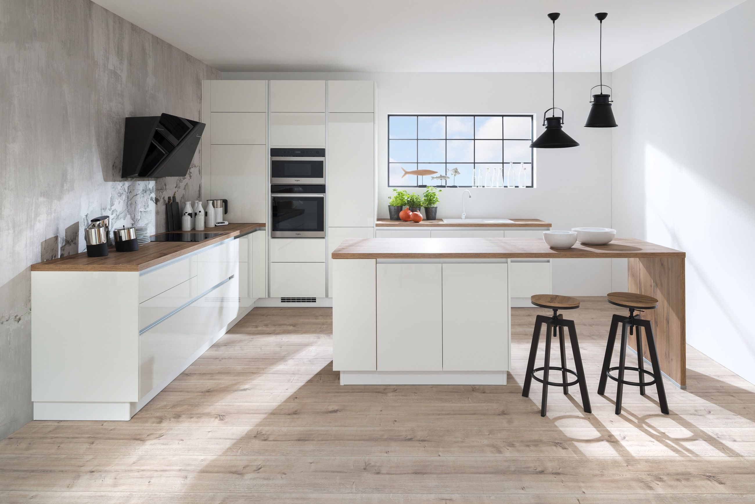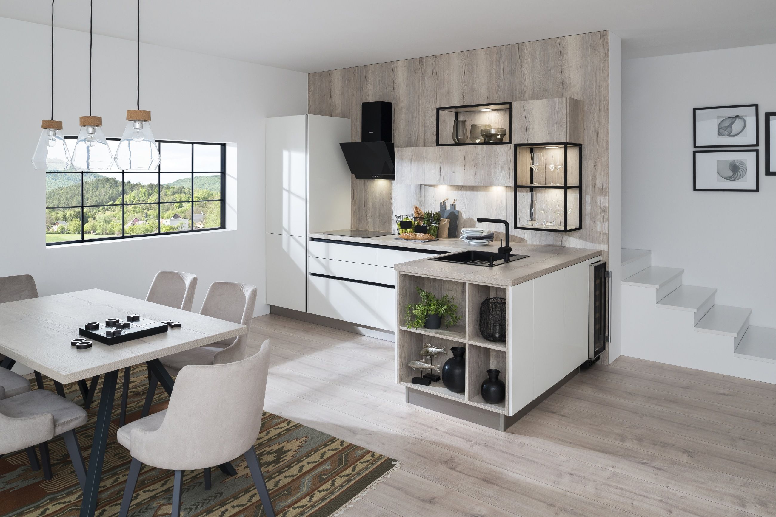 Moderní kuchyně Tilia s integrovanými úchytkami v hraně dvířek nabízí čistý, elegantní vzhled. Kombinace jednobarevných ploch a dřevodekorů umožňuje vytvořit jemně minimalistický i teplejší přírodní výraz.