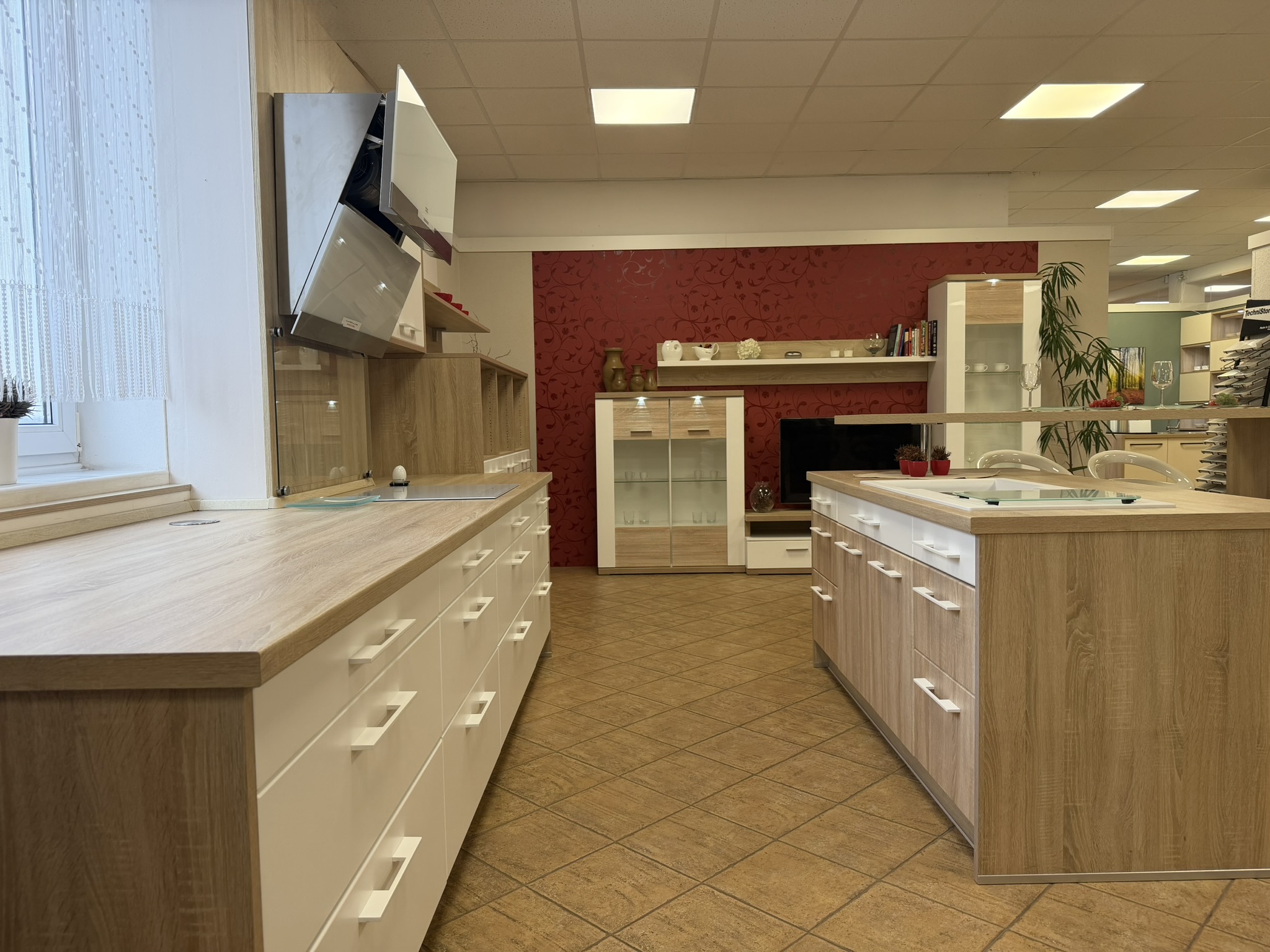 Moderní kuchyně Elis s otevřenými policemi a kombinací lesklých ploch a dřevodekorů. Nabízí čistý vzhled s odlehčeným dojmem a důrazem na detail.