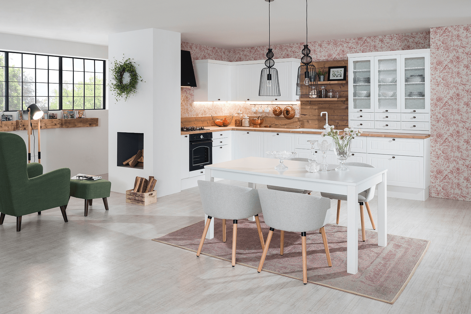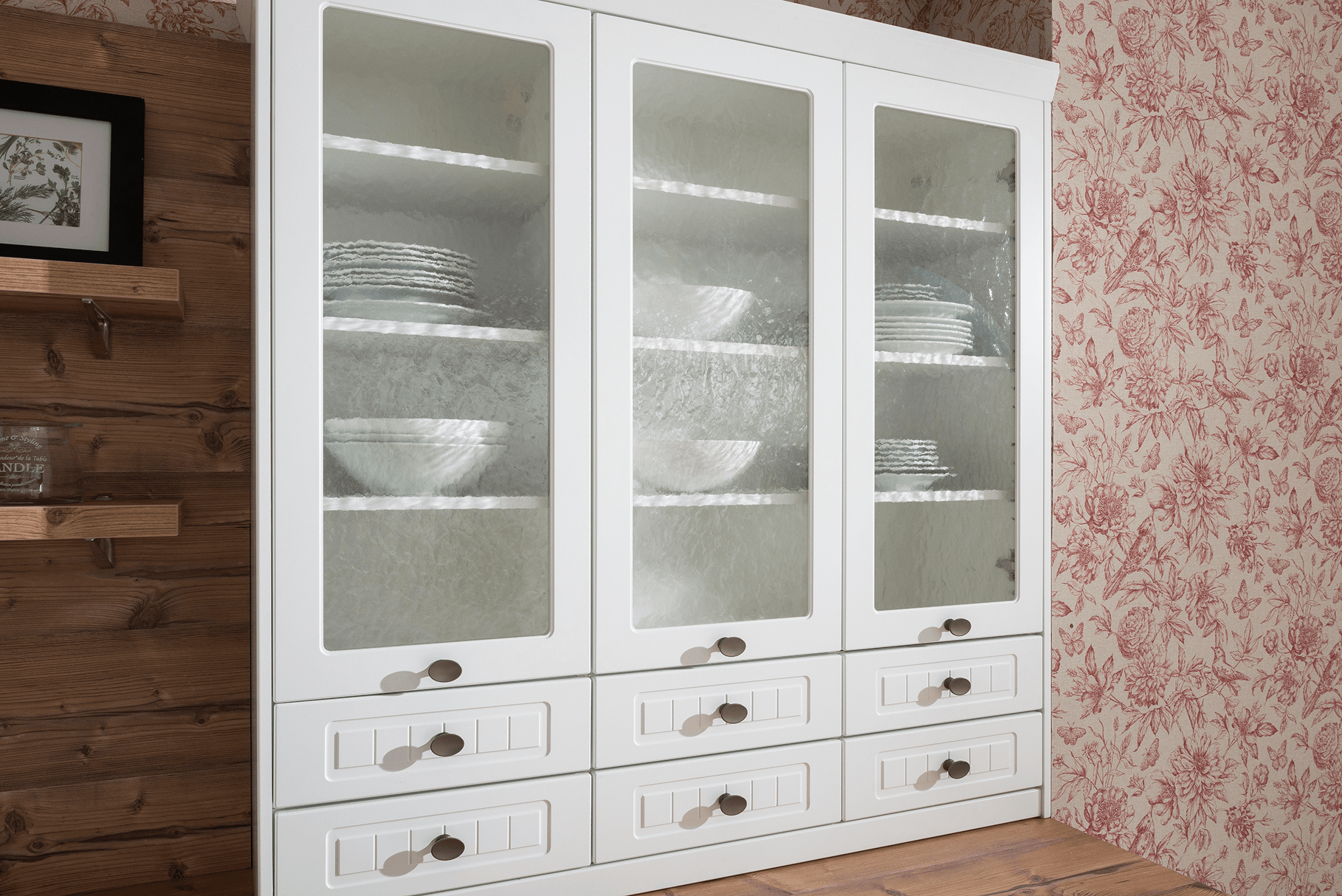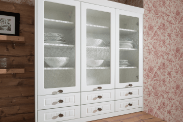 Venkovská klasická kuchyně Katy pro milovníky romantického stylu. Jemná frézovaná dvířka, kovové úchytky a vitríny vytvářejí útulný prostor s elegancí a klidem venkova. Ideální volba pro ty, kteří chtějí propojit tradici s funkčností a harmonií domova.