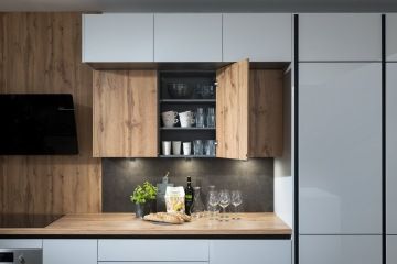 Moderní kuchyně Tilia s integrovanými úchytkami v hraně dvířek nabízí čistý, elegantní vzhled. Kombinace jednobarevných ploch a dřevodekorů umožňuje vytvořit jemně minimalistický i teplejší přírodní výraz.